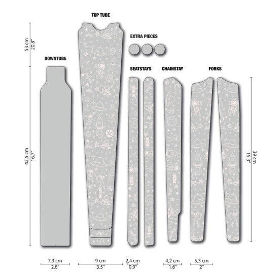 Adhésifs de protection vinyl transparent de 300 micron d’épaisseur, imprimés avec encres latex, prédécoupés pour s’adapter aux différents cadres vélos. Il peut être nécessaire de recouper certaines pièces avec une paire de ciseaux ou un cutter pour une parfaite adaptation au support.
