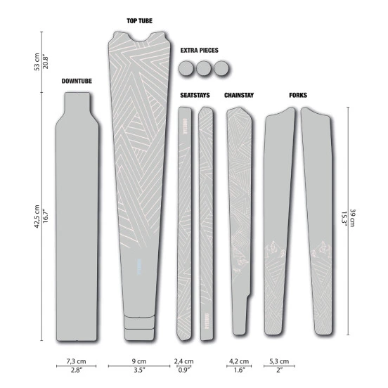 Adhésifs de protection vinyl transparent de 300 micron d’épaisseur, imprimés avec encres latex, prédécoupés pour s’adapter aux différents cadres vélos. Il peut être nécessaire de recouper certaines pièces avec une paire de ciseaux ou un cutter pour une parfaite adaptation au support.