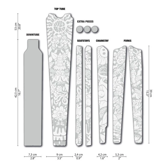 Adhésifs de protection vinyl transparent de 300 micron d’épaisseur, imprimés avec encres latex, prédécoupés pour s’adapter aux différents cadres vélos. Il peut être nécessaire de recouper certaines pièces avec une paire de ciseaux ou un cutter pour une parfaite adaptation au support.